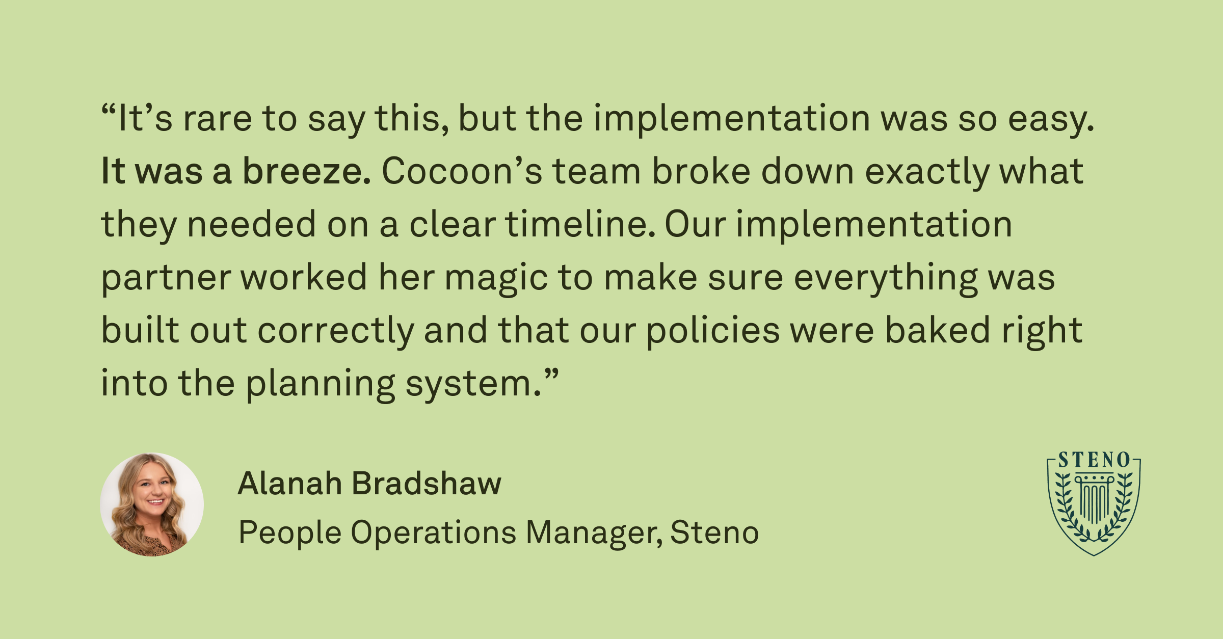 “It’s rare to say this, but the implementation was so easy. It was a breeze. Cocoon’s team broke down exactly what they needed on a clear timeline. Our implementation partner worked her magic to make sure everything was built out correctly and that our policies were baked right into the planning system.”